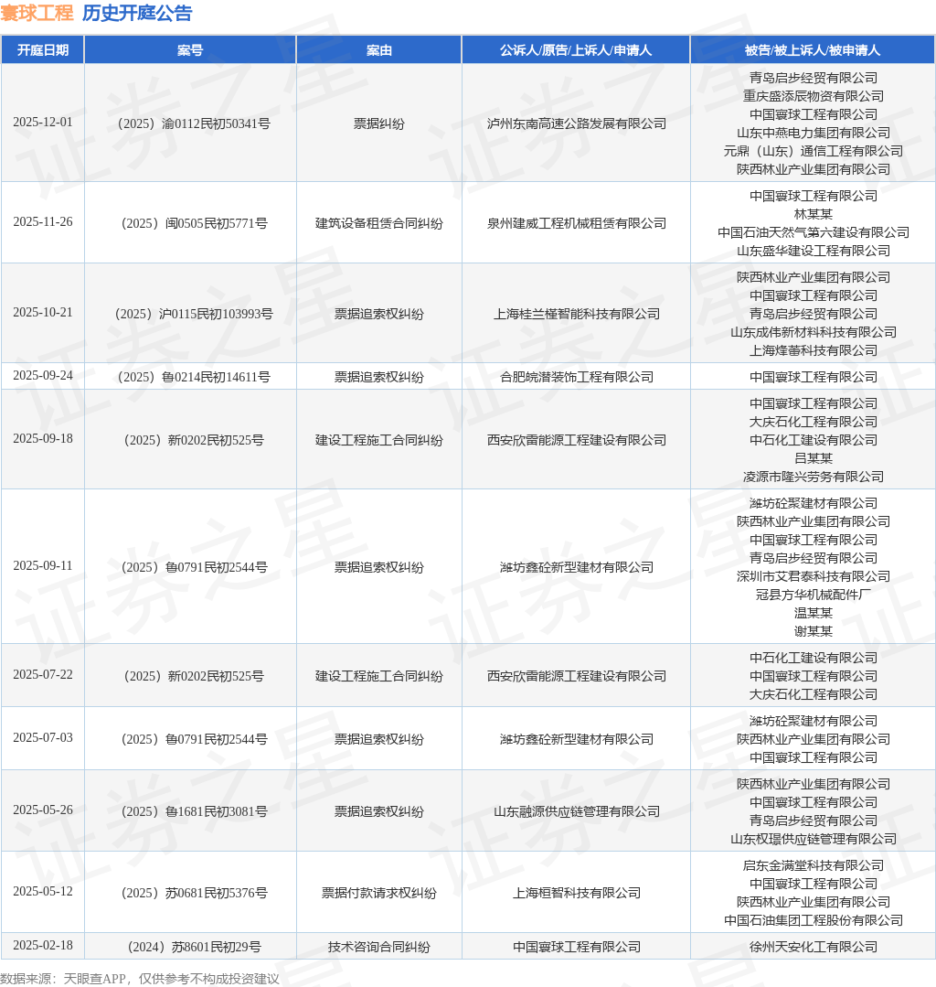 案号:(2025)闽0505民初5771号根据统计,近一年内以中国寰球工程有限公司为当事人的历史开庭公告有11则,其中案由为“票据追索权纠纷”的公告以5则居首,其次为“建设工程施工合同纠纷”有2则,“建筑设备租赁合同纠纷”有1则。历史开庭公告如下: