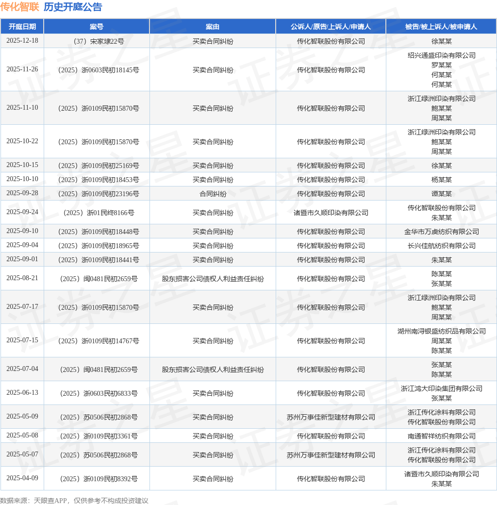 案号:(2025)浙0603民初18145号根据统计,近一年内以传化智联股份有限公司为当事人的历史开庭公告有24则,其中案由为“买卖合同纠纷”的公告以21则居首,其次为“股东损害公司债权人利益责任纠纷”有2则,“合同纠纷”有1则。历史开庭公告(前20条)如下: