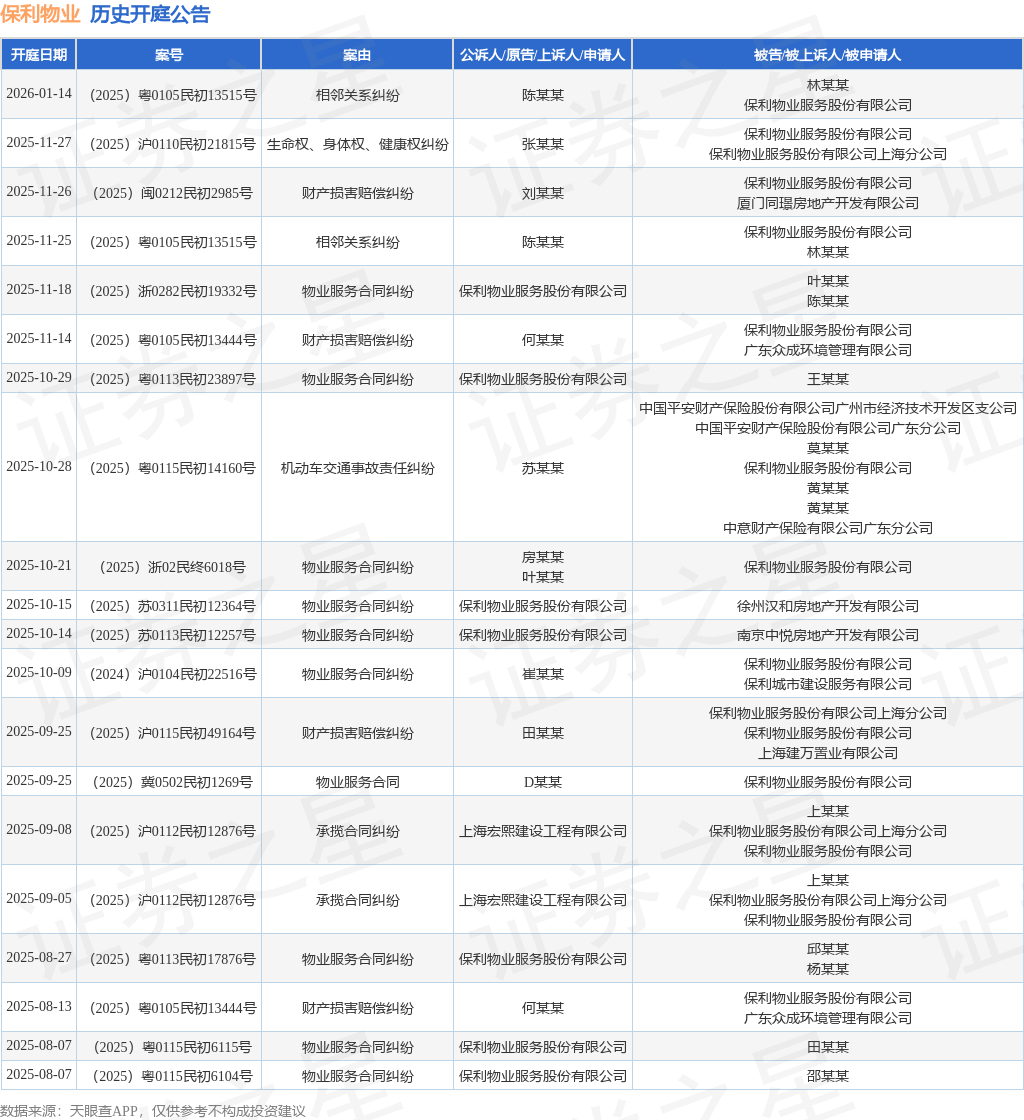 证券之星消息,根据天眼查APP显示,近日公布了一则保利物业服务股份有限公司作为被告/被上诉人的开庭公告,详细内容如下: