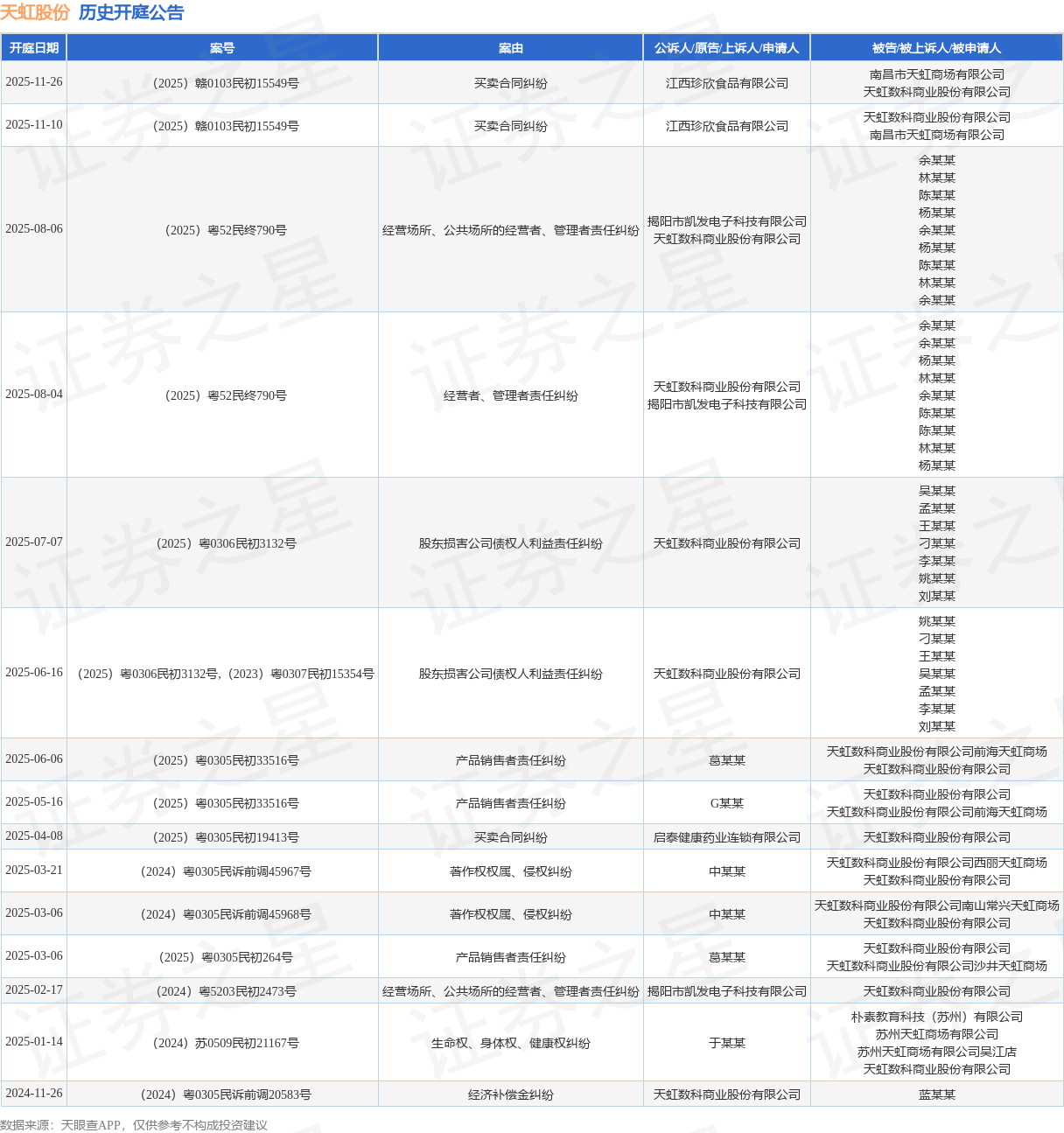 案号:(2025)赣0103民初15549号根据统计,近一年内以天虹数科商业股份有限公司为当事人的历史开庭公告有15则,其中案由为“买卖合同纠纷”的公告以3则居首,其次为“产品销售者责任纠纷”有3则,“经营场所、公共场所的经营者、管理者责任纠纷”有2则。历史开庭公告如下: