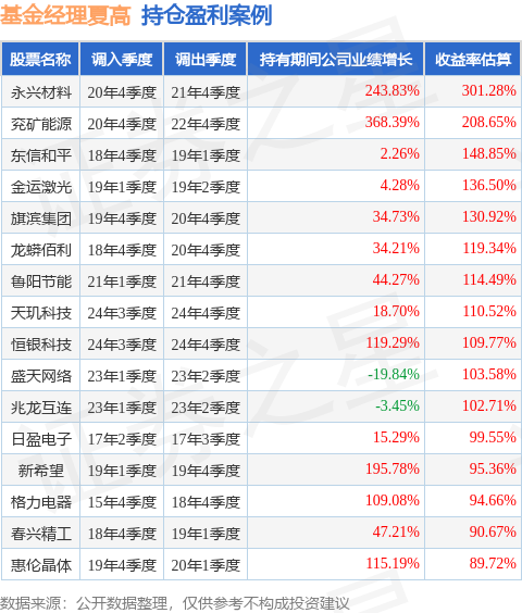夏高管理的大成中证红利指数A基金在20年4季度买入永兴材料,在持有1年又0个季度后在21年4季度卖出。持有期间的估算收益率为301.28%,持有期间永兴材料在2020年到2021年的年报归属净利润增幅达243.83%。