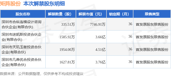 证券之星消息,根据市场公开信息整理,矩阵股份(301365)于11月24日将有5503.24万股限售股份解禁,为公司首发原股东限售股份,占公司总股本30.57%。(本次数据根据历史公告整理得出,实际情况以上市公司最新公告为准)本次解禁后,公司还有7861.76万股限售股份,占总股本43.68%。具体如下图所示: