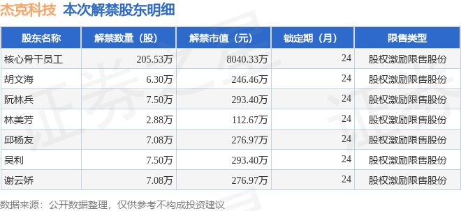 证券之星消息,根据市场公开信息整理,杰克科技(603337)于11月24日将有243.87万股限售股份解禁,为公司股权激励限售股份,占公司总股本0.51%。(本次数据根据历史公告整理得出,实际情况以上市公司最新公告为准)最近一年内,该股累计解禁352.19万股,占总股本的0.74%。本次解禁后,公司还有270.18万股限售股份,占总股本0.57%。具体如下图所示: