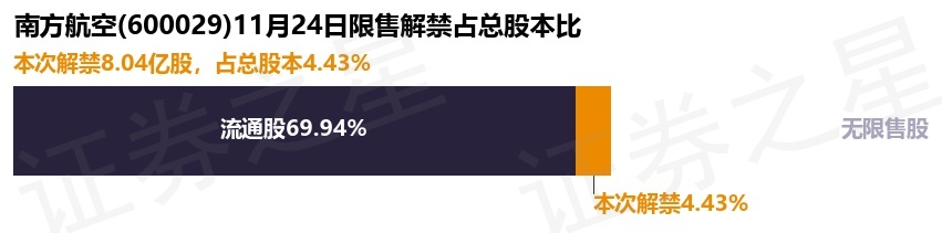 证券之星消息,根据市场公开信息整理,南方航空(600029)于11月24日将有8.04亿股限售股份解禁,为公司定向增发机构配售股份,占公司总股本4.43%。(本次数据根据历史公告整理得出,实际情况以上市公司最新公告为准)本次解禁后,公司已无限售股份。具体如下图所示: