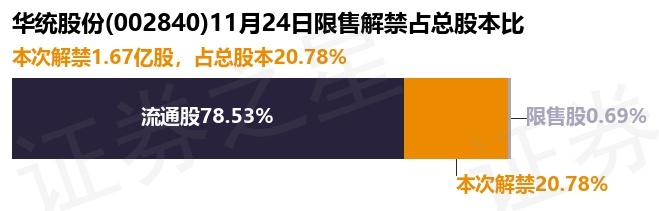 证券之星消息,根据市场公开信息整理,华统股份(002840)于11月24日将有1.67亿股限售股份解禁,为公司定向增发机构配售股份,占公司总股本20.78%。(本次数据根据历史公告整理得出,实际情况以上市公司最新公告为准)最近一年内,该股累计解禁1.33亿股,占总股本的16.53%。本次解禁后,公司还有553.6万股限售股份,占总股本0.69%。具体如下图所示: