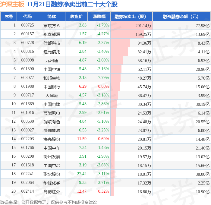 沪深主板融券净卖出前三分别为:京东方A(000725)融券净卖出201.14万股、永泰能源(600157)融券净卖出159.25万股、佳都科技(600728)融券净卖出94.36万股,前20具体见下表: