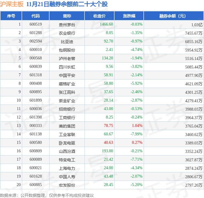 沪深主板融券余额前三分别为:贵州茅台(600519)融券余额1.03亿元、农业银行(601288)融券余额7455.67万元、比亚迪(002594)融券余额6855.16万元,前20具体见下表: