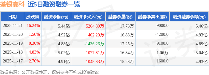 荃银高科融资融券信息显示,融资方面,当日融资买入2.49亿元,融资偿还1.96亿元,融资净买入5264.8万元。融券方面,融券卖出1.42万股,融券偿还5200.0股,融券余量17.73万股,融券余额209.39万元。融资融券余额5.46亿元。