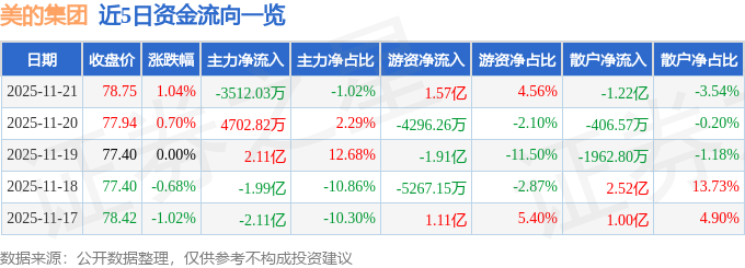 证券之星消息,截至2025年11月21日收盘,美的集团(000333)报收于78.75元,上涨1.04%,换手率0.63%,成交量43.95万手,成交额34.43亿元。