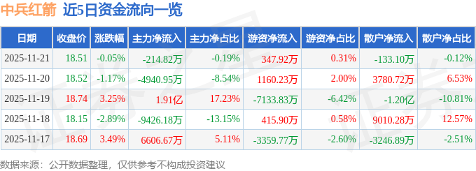 证券之星消息,截至2025年11月21日收盘,中兵红箭(000519)报收于18.51元,下跌0.05%,换手率4.33%,成交量60.28万手,成交额11.11亿元。