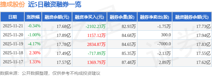 捷成股份融资融券信息显示,融资方面,当日融资买入6627.65万元,融资偿还8729.88万元,融资净偿还2102.23万元。融券方面,融券卖出5900.0股,融券偿还2.34万股,融券余量82.93万股,融券余额488.46万元。融资融券余额17.73亿元。
