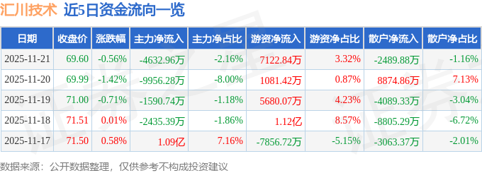 证券之星消息,截至2025年11月21日收盘,汇川技术(300124)报收于69.6元,下跌0.56%,换手率1.3%,成交量30.89万手,成交额21.49亿元。