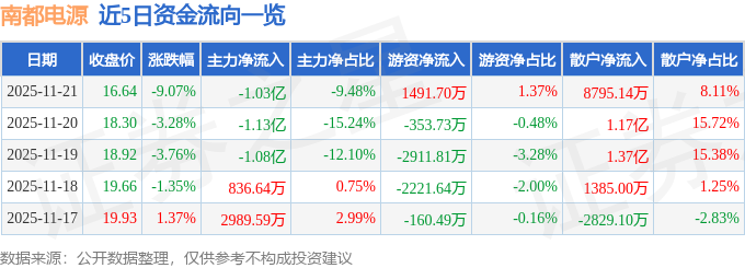 证券之星消息,截至2025年11月21日收盘,南都电源(300068)报收于16.64元,下跌9.07%,换手率7.42%,成交量63.3万手,成交额10.85亿元。