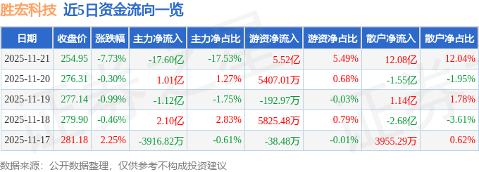 证券之星消息,截至2025年11月21日收盘,胜宏科技(300476)报收于254.95元,下跌7.73%,换手率4.51%,成交量38.59万手,成交额100.38亿元。