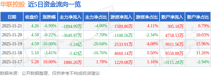 证券之星消息,截至2025年11月21日收盘,华联控股(000036)报收于4.26元,下跌6.99%,换手率6.29%,成交量88.18万手,成交额3.87亿元。