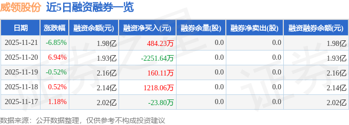 威领股份融资融券信息显示,融资方面,当日融资买入3954.53万元,融资偿还3470.3万元,融资净买入484.23万元。融券方面,融券卖出0.0股,融券偿还0.0股,融券余量0.0股,融券余额0.0万元。融资融券余额1.98亿元。