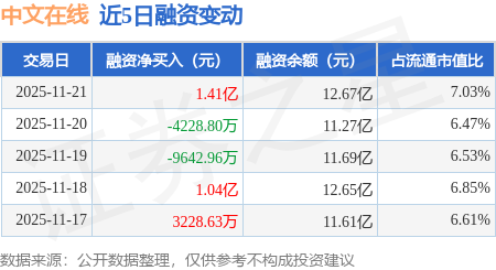 证券之星消息,11月21日,中文在线(300364)融资买入3.41亿元,融资偿还2.01亿元,融资净买入1.41亿元,融资余额12.67亿元,当日融资净买入排名第5。