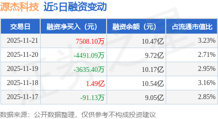 证券之星消息,11月21日,源杰科技(688498)融资买入3.2亿元,融资偿还2.45亿元,融资净买入7508.1万元,融资余额10.47亿元,当日融资净买入排名第20。