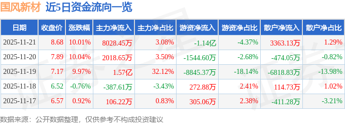 证券之星消息,截至2025年11月21日收盘,国风新材(000859)报收于8.68元,上涨10.01%,已连续涨停3天,换手率35.34%,成交量316.64万手,成交额26.05亿元。