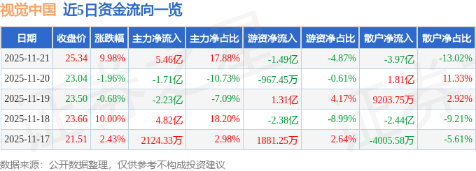 证券之星消息,截至2025年11月21日收盘,视觉中国(000681)报收于25.34元,上涨9.98%,涨停,换手率18.76%,成交量126.83万手,成交额30.54亿元。