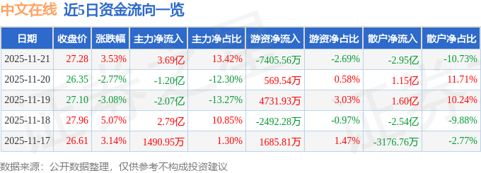 11月21日的资金流向数据方面,主力资金净流入3.69亿元,占总成交额13.42%,游资资金净流出7405.56万元,占总成交额2.69%,散户资金净流出2.95亿元,占总成交额10.73%。