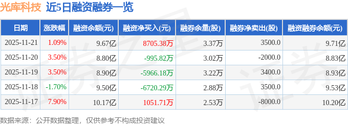 光库科技融资融券信息显示,融资方面,当日融资买入3.65亿元,融资偿还2.78亿元,融资净买入8705.38万元,净买入额两市排名第15。融券方面,融券卖出3500.0股,融券偿还0.0股,融券余量3.37万股,融券余额372.38万元。融资融券余额9.71亿元。