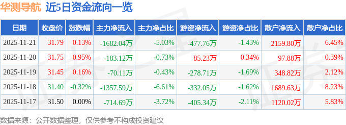 证券之星消息,截至2025年11月21日收盘,华测导航(300627)报收于31.79元,上涨0.13%,换手率1.62%,成交量10.52万手,成交额3.35亿元。