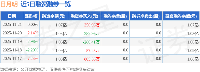 日月明融资融券信息显示,融资方面,当日融资买入1339.58万元,融资偿还982.65万元,融资净买入356.93万元。融券方面,融券卖出0.0股,融券偿还0.0股,融券余量0.0股,融券余额0.0万元。融资融券余额1.07亿元。