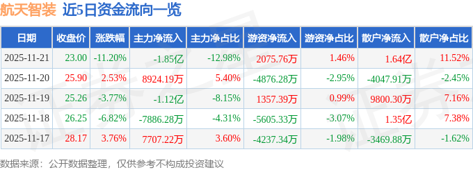 证券之星消息,截至2025年11月21日收盘,航天智装(300455)报收于23.0元,下跌11.2%,换手率8.37%,成交量59.33万手,成交额14.21亿元。