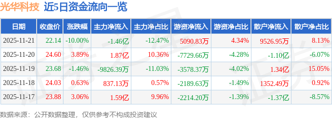 证券之星消息,截至2025年11月21日收盘,光华科技(002741)报收于22.14元,下跌10.0%,跌停,换手率12.06%,成交量51.41万手,成交额11.73亿元。