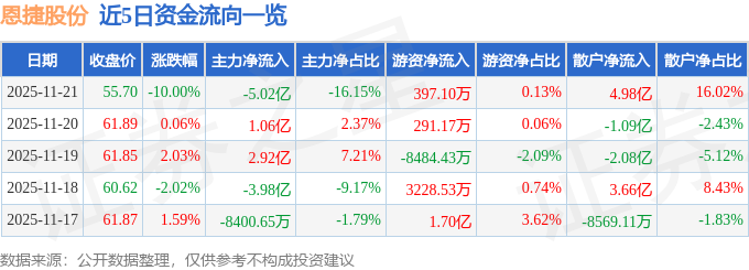 证券之星消息,截至2025年11月21日收盘,恩捷股份(002812)报收于55.7元,下跌10.0%,跌停,换手率6.67%,成交量54.85万手,成交额31.08亿元。