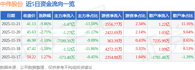证券之星消息,截至2025年11月21日收盘,中伟股份(300919)报收于41.13元,下跌9.86%,换手率2.8%,成交量25.59万手,成交额10.92亿元。