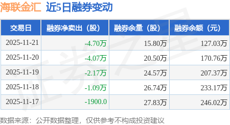证券之星消息,11月21日,海联金汇(002537)融资买入2429.91万元,融资偿还2057.05万元,融资净买入372.85万元,融资余额5.65亿元,近20个交易日中有11个交易日出现融资净买入。