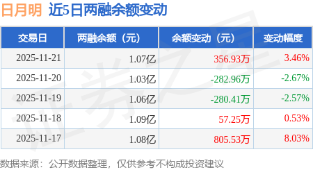 证券之星消息,11月21日,日月明(300906)融资买入1339.58万元,融资偿还982.65万元,融资净买入356.93万元,融资余额1.07亿元。
