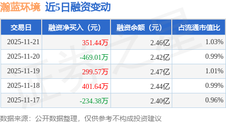 证券之星消息,11月21日,瀚蓝环境(600323)融资买入1219.59万元,融资偿还868.14万元,融资净买入351.44万元,融资余额2.46亿元。
