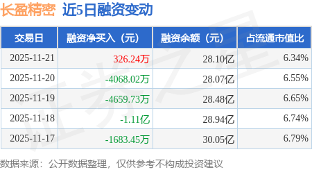 证券之星消息,11月21日,长盈精密(300115)融资买入4.47亿元,融资偿还4.44亿元,融资净买入326.24万元,融资余额28.1亿元。