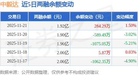 证券之星消息,11月21日,中毅达(600610)融资买入2557.14万元,融资偿还2280.27万元,融资净买入276.87万元,融资余额1.92亿元,近20个交易日中有11个交易日出现融资净买入。