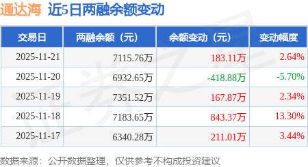 证券之星消息,11月21日,通达海(301378)融资买入983.5万元,融资偿还800.39万元,融资净买入183.11万元,融资余额7115.76万元。