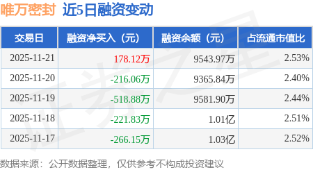 证券之星消息,11月21日,唯万密封(301161)融资买入921.77万元,融资偿还743.65万元,融资净买入178.12万元,融资余额9543.97万元。
