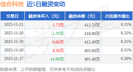 证券之星消息,11月21日,佳合科技(920392)融资买入56.67万元,融资偿还54.94万元,融资净买入1.73万元,融资余额412.53万元。