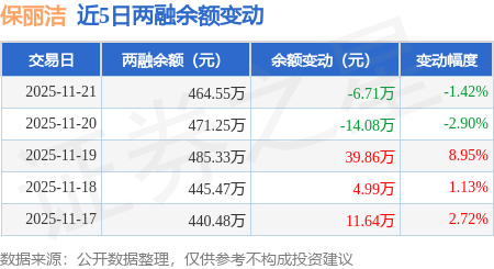 证券之星消息,11月21日,保丽洁(920802)融资买入14.7万元,融资偿还21.4万元,融资净卖出6.71万元,融资余额464.55万元,近20个交易日中有11个交易日出现融资净买入。