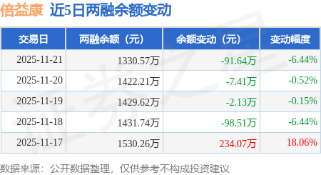 证券之星消息,11月21日,倍益康(920199)融资买入152.02万元,融资偿还243.66万元,融资净卖出91.64万元,融资余额1330.57万元。