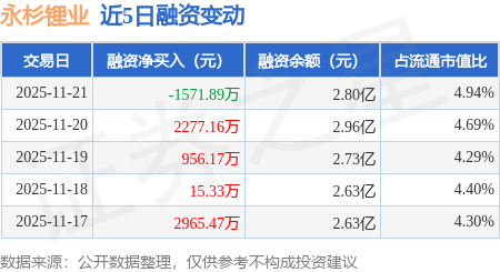 证券之星消息,11月21日,永杉锂业(603399)融资买入4350.05万元,融资偿还5921.94万元,融资净卖出1571.89万元,融资余额2.8亿元。