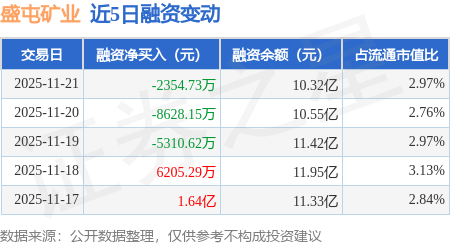 证券之星消息,11月21日,盛屯矿业(600711)融资买入2.39亿元,融资偿还2.63亿元,融资净卖出2354.73万元,融资余额10.32亿元,近20个交易日中有14个交易日出现融资净买入。