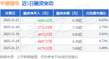 证券之星消息,11月21日,华盛锂电(688353)融资买入2.01亿元,融资偿还2.43亿元,融资净卖出4206.62万元,融资余额6.7亿元,近20个交易日中有13个交易日出现融资净买入。