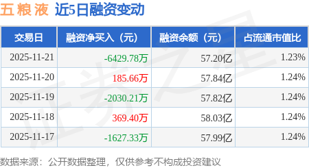 证券之星消息,11月21日,五 粮 液(000858)融资买入1.39亿元,融资偿还2.04亿元,融资净卖出6429.78万元,融资余额57.2亿元。
