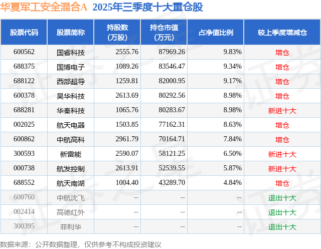 根据2025基金Q3季报公募基金重仓股数据,重仓该股的公募基金共51家,其中持有数量最多的公募基金为华夏基金的华夏军工安全混合A。华夏军工安全混合A目前规模为33.97亿元,最新净值1.673(11月21日),较上一交易日下跌3.13%,近一年上涨17.24%。该公募基金现任基金经理为万方方。