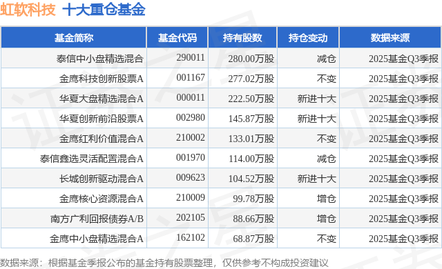 根据2025基金Q3季报公募基金重仓股数据,重仓该股的公募基金共31家,其中持有数量最多的公募基金为泰信基金的泰信中小盘精选混合。泰信中小盘精选混合目前规模为17.22亿元,最新净值3.914(11月21日),较上一交易日下跌3.41%,近一年上涨24.97%。该公募基金现任基金经理为董季周。董季周在任的基金产品包括:泰信鑫选灵活配置混合A,管理时间为2020年11月24日至今,期间收益率为0.41%。