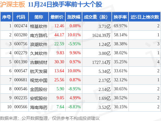 当日沪深主板换手率前10大个股中7只个股收涨,平均涨幅5.27%,其中榕基软件(002474)以换手率69.97%排第一,7只个股近5个交易日中多次上榜。