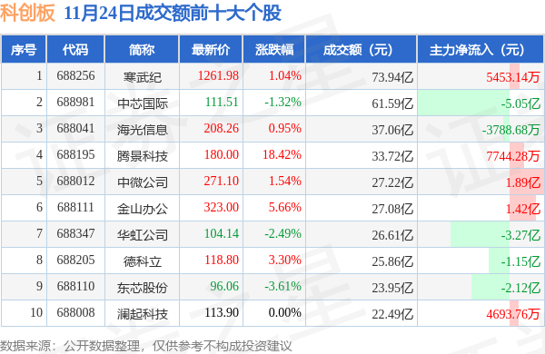 当日科创板成交额前10大个股中6只个股收涨,平均涨幅5.15%,其中寒武纪(688256)以成交额73.94亿元排第一。从主力资金流入看,成交额前10大个股中有5只个股呈现主力资金净流入。